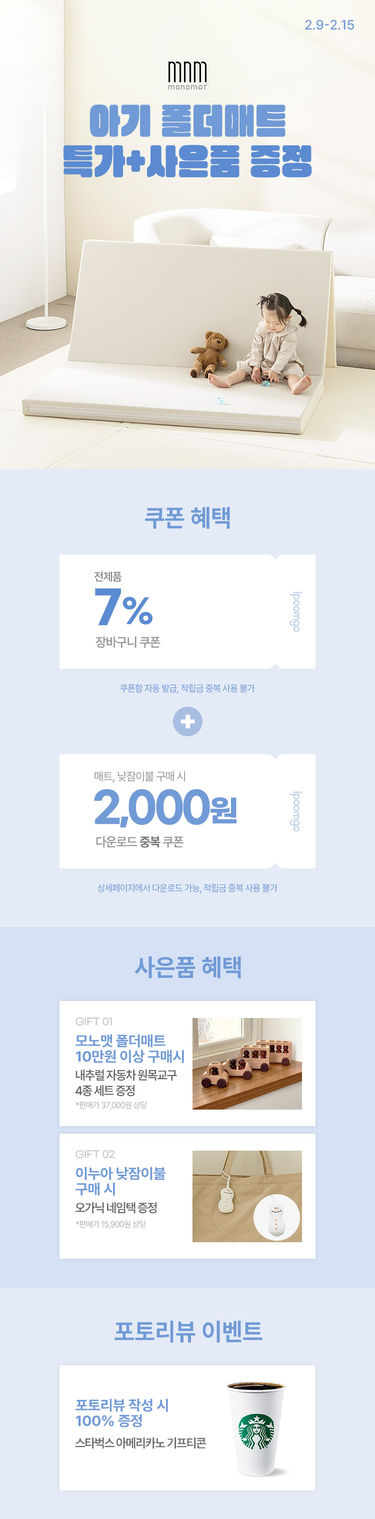 장바구니 쿠폰 7%+다운로드 쿠폰 [모노맷1+1]140x300x4cm 항균코팅 논슬립 층간소음방지 틈새 없는 아기 폴더매트